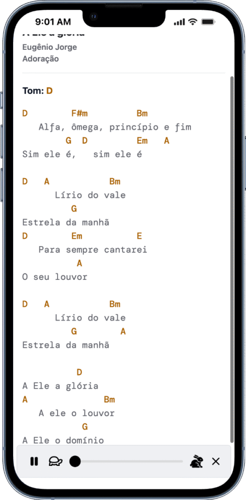 Toque sem interrupções. A cifra rola sozinha na velocidade que você definir.